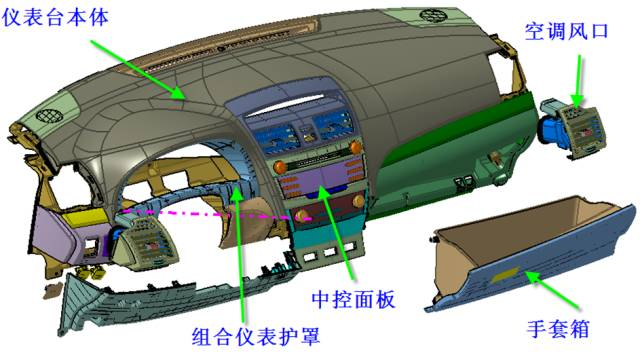主要包括主儀表臺(tái)總成、儀表臺(tái)管梁總成、副儀表臺(tái)總成。